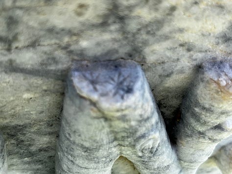 Mom balances like a flamingo beside it, raises her right leg forward to compare her own size six flip-flop-clad foot. The top of the ankle comes to her waist–just the right height for her to steady herself, oblivious to the sign that says, “Please do not touch,”