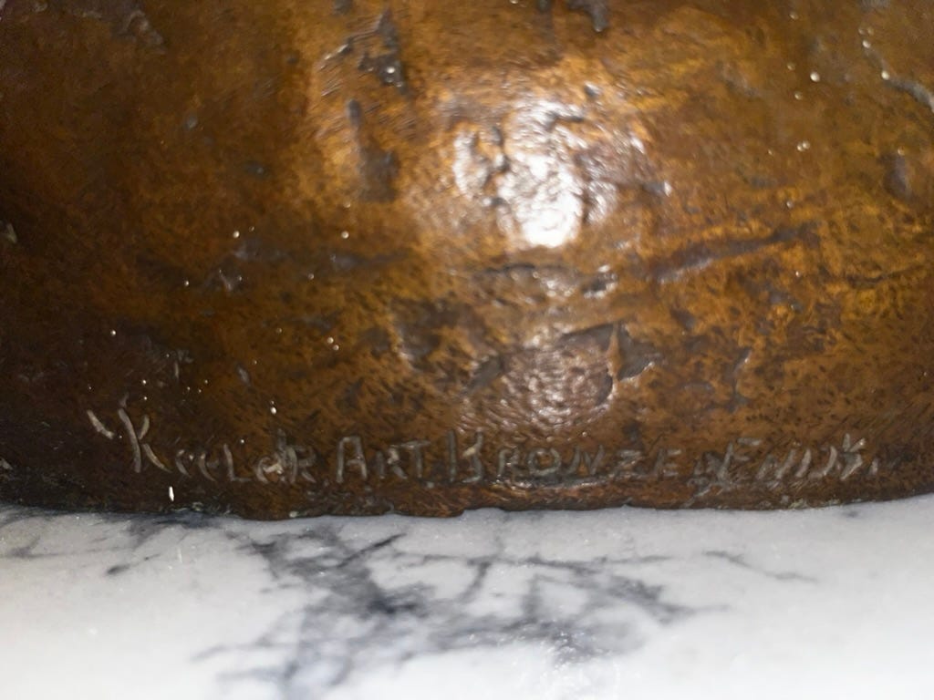 In June of 1934, the widow of sculptor Charlie Russell sued and settled with Fred E. Keeler to have returned several of Russell’s works which were in Keeler’s possession. The documentation states that he was doing business as “Keeler Art Bronze Works” as well as “California Art Bronze Foundry,” Guido Nelli’s operation. In August, Fred E. Keeler filed for bankruptcy, after which he was sued by another sculptor, Atanas Katchamakoff of Palm Springs, for losing the original plaster mold of his “Pregnant Madonna.” The question becomes, were any works ever produced by Fred E. Keeler with the “Keeler Art Bronze” foundry mark? I can find no records. I ask the internet and the answer comes back a resounding no.